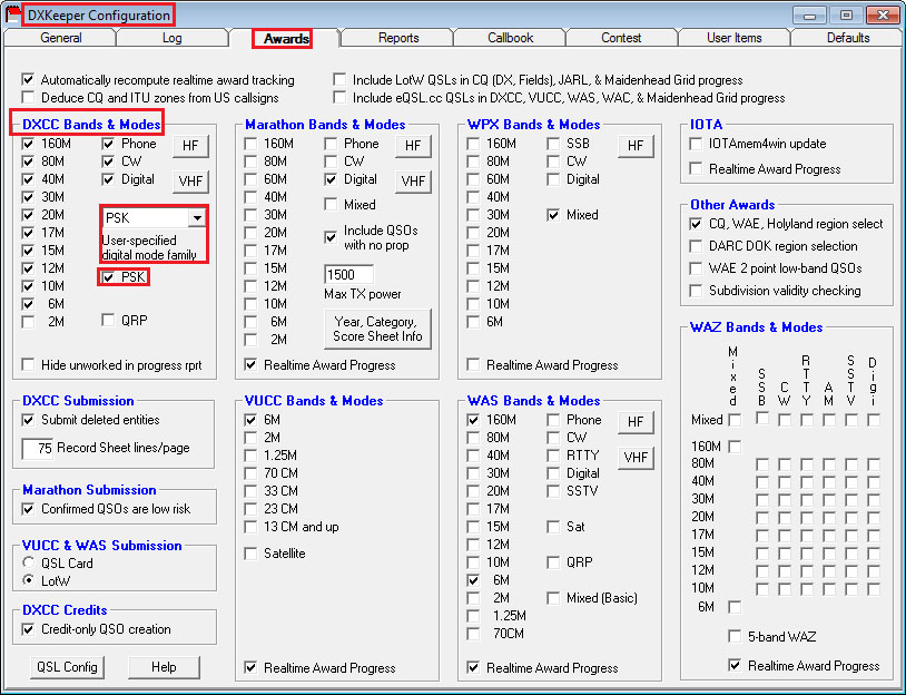 Each log file can be configured to provide realtime DXCC award tracking for a user-specified digital mode family; log files created by versions of DXKeeper prior to 15.3.3 provide DXCC award tracking for the PSK family.
