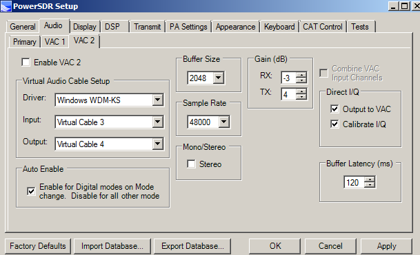 Select the VAC 2 tab of PowerSDR's Setup window, and configure it as shown here: