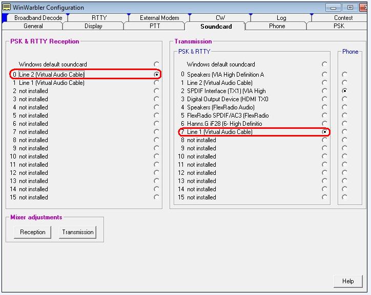 in the PSK & RTTY Reception panel, select the Virtual Audio Cable line that you specified as the Output in the VIrtual Audio Cable Setup panel on the PowerSDR Setup window's VAC tab