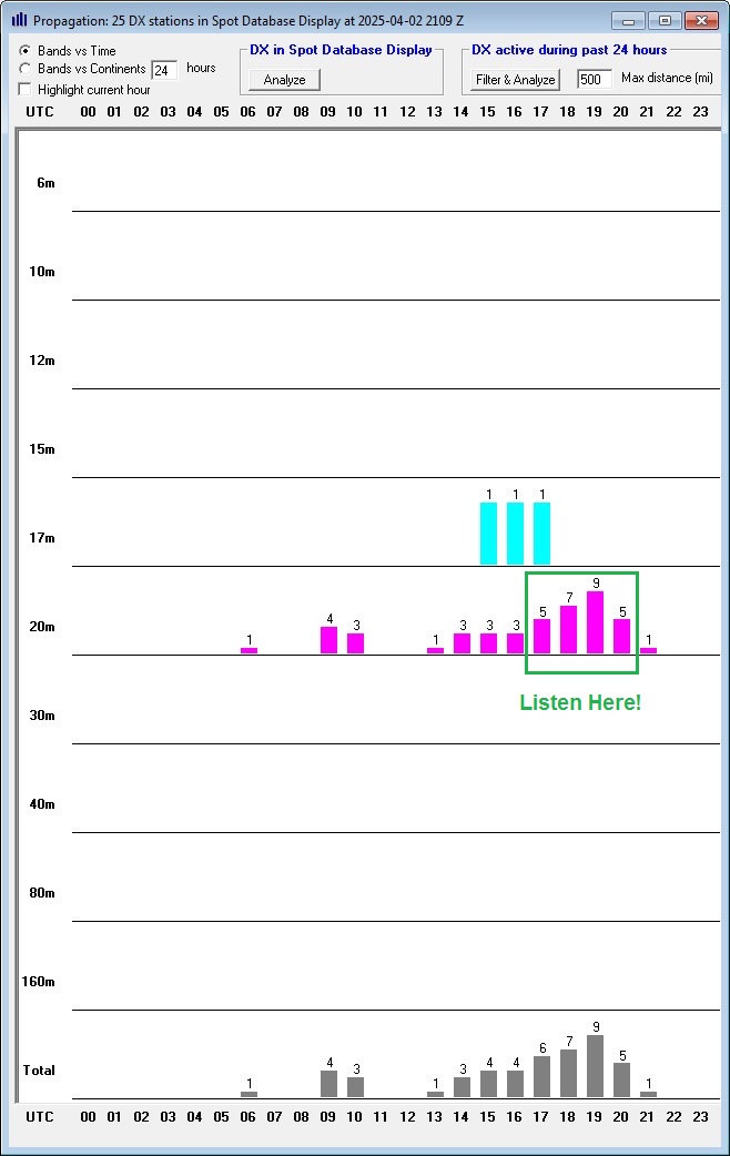 Monitoring the intersection of a target station’s recent activity with propagation openings to that target station optimizes your ability to obtain a sought-after QSO before the target station is spotted and cluster hordes descend on the frequency.